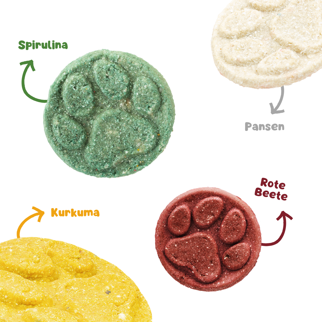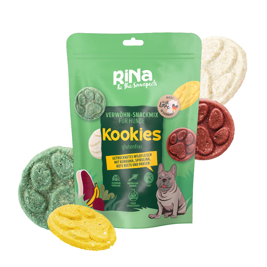 Entdecken Sie die bunte Welt unserer KOOKIES – der ultimative Snackmix für Ihren Hund! Gelbe KOOKIES mit Kurkuma wirken entzündungshemmend, grüne mit Spirulina stärken das Immunsystem, rote mit Roter Beete fördern Haut und Verdauung, und beige mit Pansen unterstützen eine gesunde Darmflora.